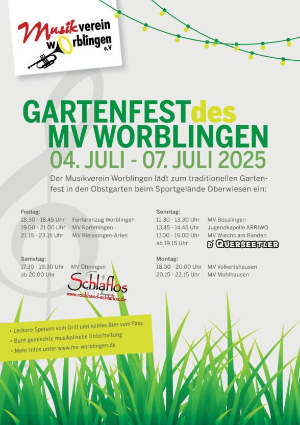Vom 04.07. - 07.07.2025 findet das diesjährige Gartenfest des Musikverein Worblingen im Obstgarten bei den Sportanlagen Oberwiesen in Worblingen statt